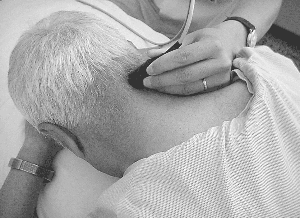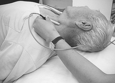 位于枕部的骨性標志枕骨粗隆下方,發際上1cm左右,探頭置于枕窗中央部朝向枕骨大孔或置于兩旁(枕旁窗)。經枕窗檢測時受檢者一般取坐位,頭頸部放松稍向前屈,下頜略向胸部抵近。病情危重或行動不便者也可采用側臥位,同樣將下頜抵向胸前,保持頭頸部的前屈位置。通過枕窗及枕旁窗可以檢測雙側椎動脈(VA)和基底動脈(BA),也能檢測小腦后下動脈(PICA),但不夠恒定.
