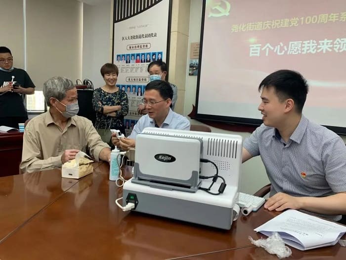 活動最后,公司領(lǐng)導(dǎo)親自用自主研發(fā)的超聲骨密度儀為五位老同志測量骨密度,并為老人耐心講解說明測量報告結(jié)果,給他們提出身體保養(yǎng)建議。